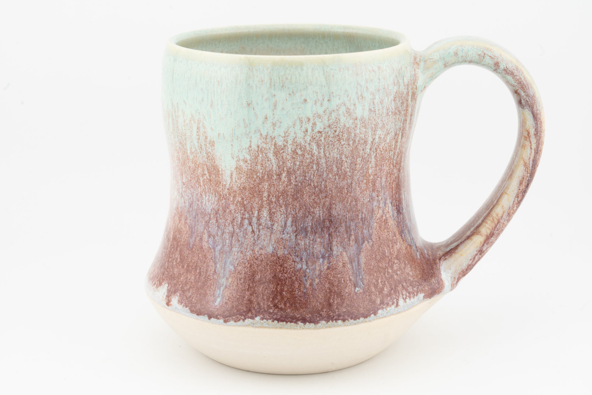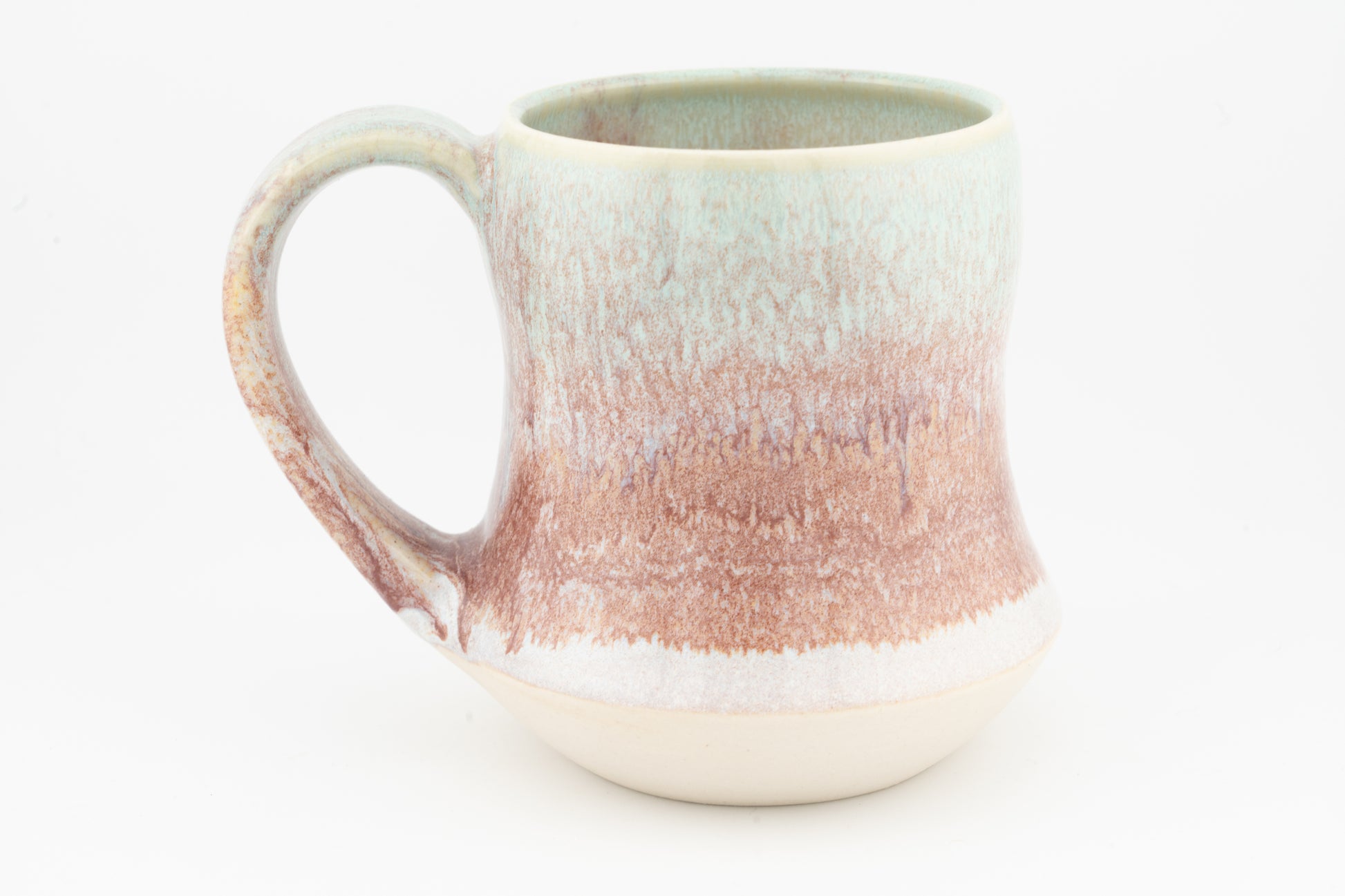 Our tall, curved style, ceramic mug holds 12 or 16 oz of fluid liquid. We pull our handles and add small embellishments after attaching them around the bottom.