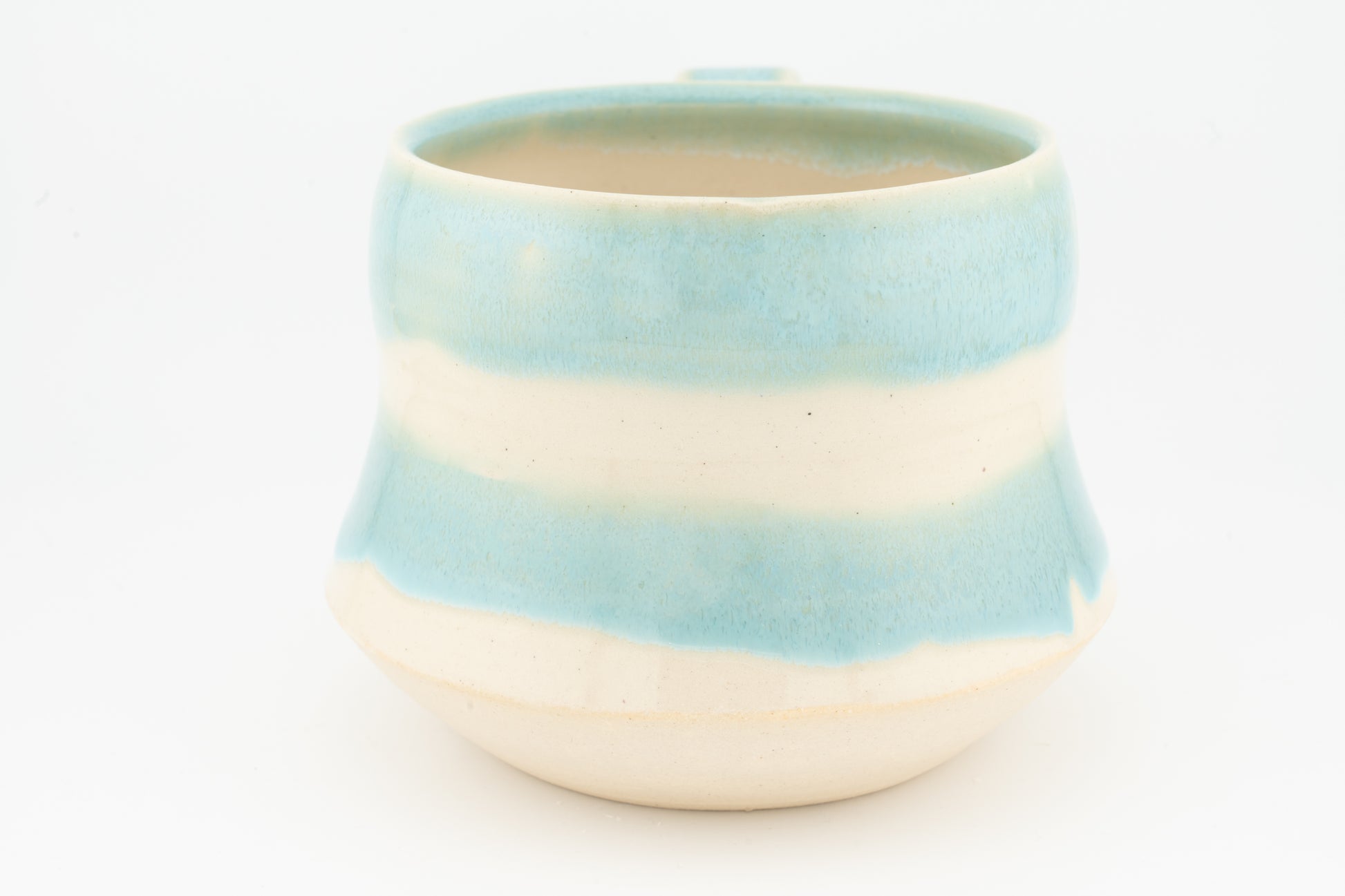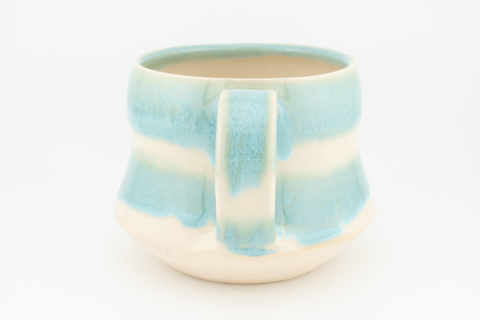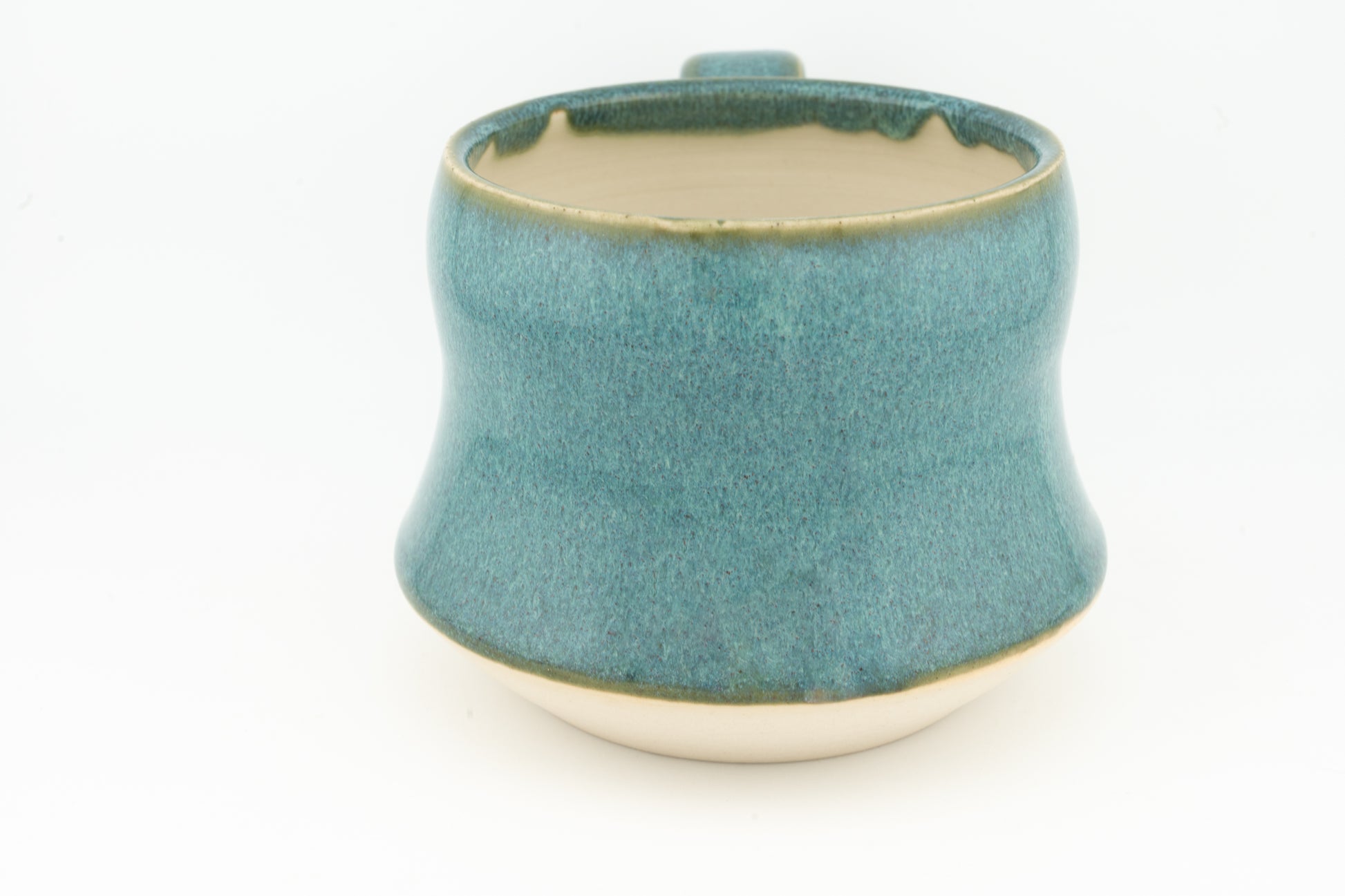 Our wide, curved style, ceramic mug holds 12 or 16 oz of fluid liquid. We pull our handles and add small embellishments after attaching them around the bottom.